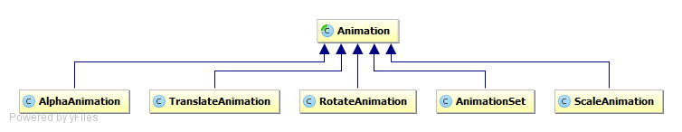 These four animation classes can be used for transitions between activities, layouts, views, and so on. All these can be defined in the layout XML file as <alpha>, <rotate>, <scale> and <translate>. They all have to be contained within an AnimationSet <set>: